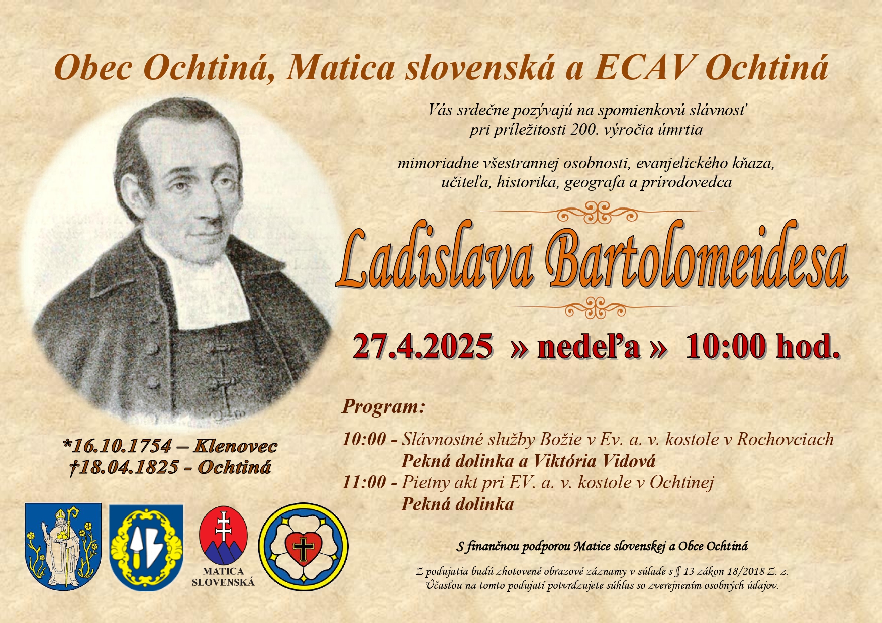 Srdečne Vás pozývame na spomienkovú slávnosť pri príležitosti 200. výročia úmrtia mimoriadne všestrannej osobnosti, evanjelického kňaza, učiteľa, historika, geografa a prírodovedca Ladislava Bartolomeidesa